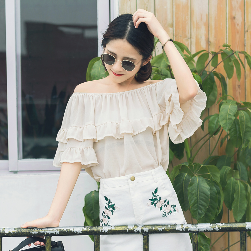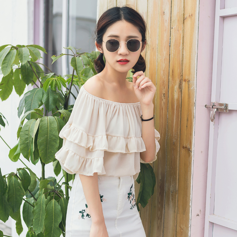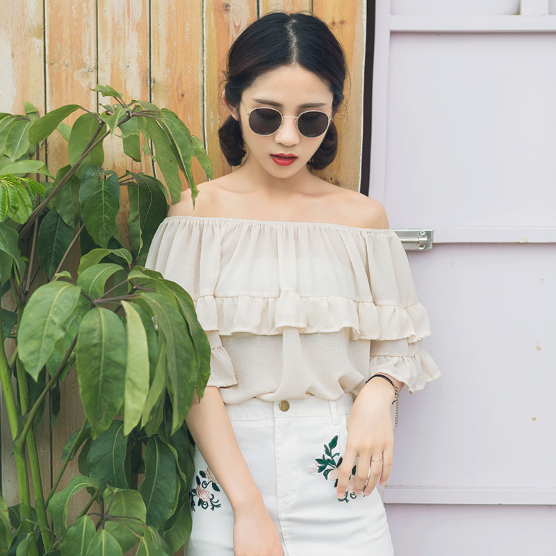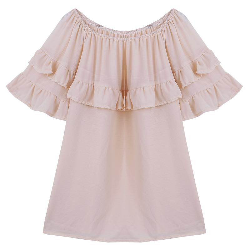 / 夏裝韓版新款女裝甜美荷葉邊一字領露肩袖雪紡衫寬松上衣夏潮