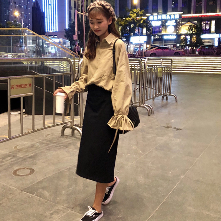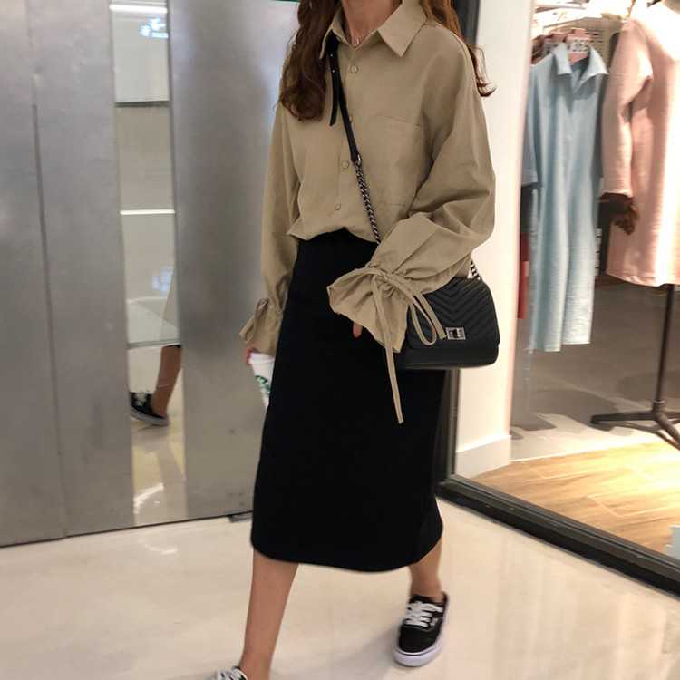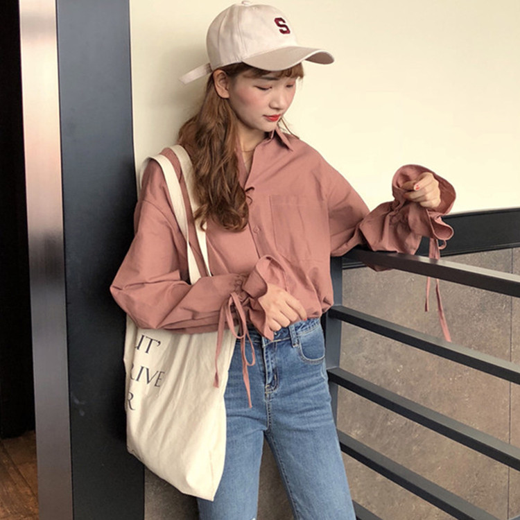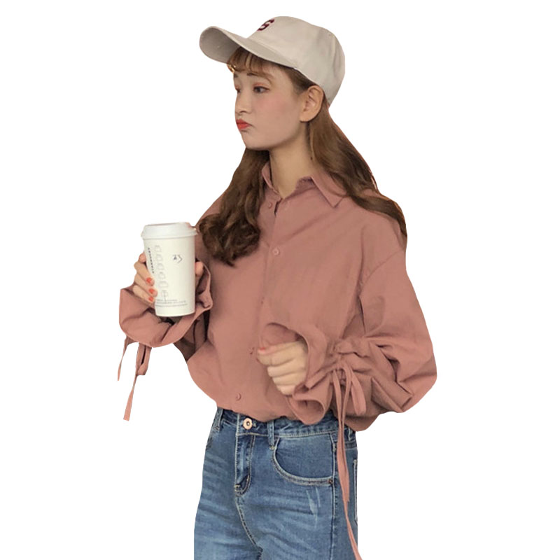 / 秋季韓版復古純色寬松chic袖口綁帶襯衫學生中長款休閑長袖襯衣女