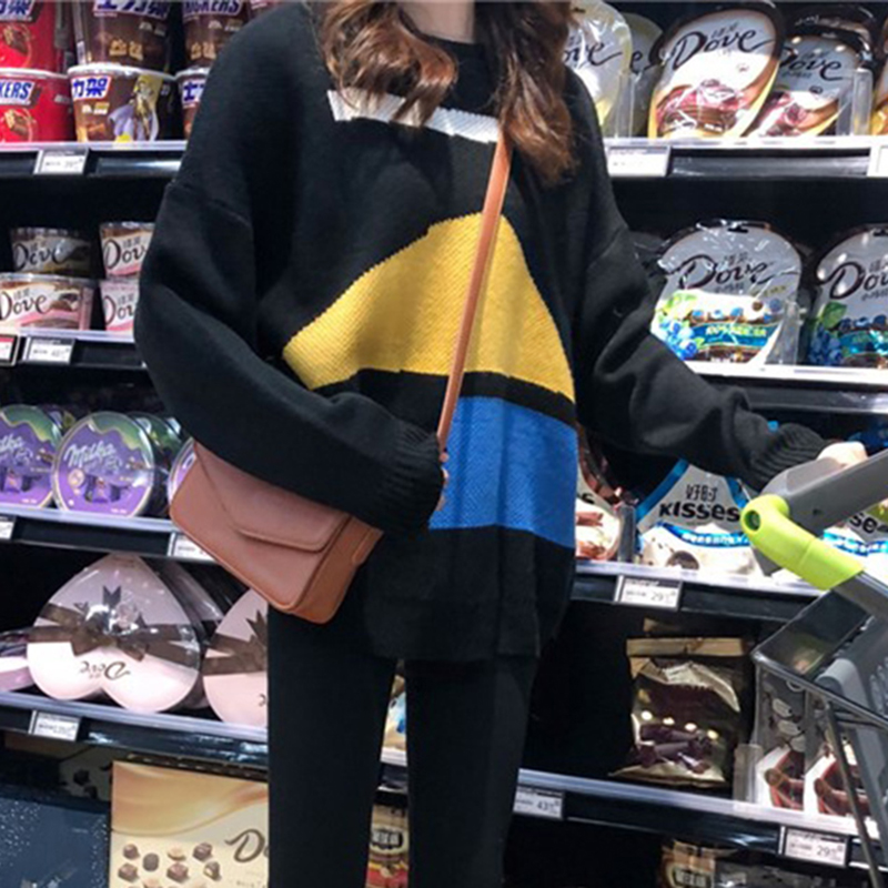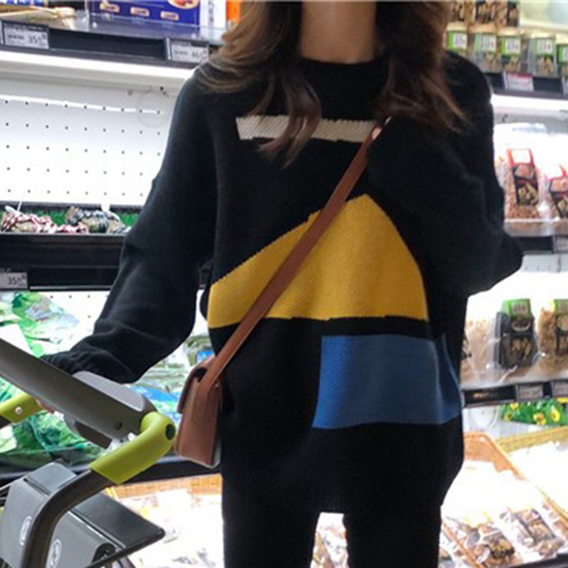 秋裝女2018新款韓版學生拼色寬松長袖毛衣時尚慵懶風清新圓領上衣
