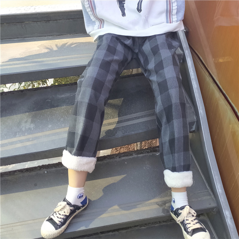 / 秋冬女裝韓版寬松格子加絨休閑褲工裝褲子高腰直筒褲闊腿褲九分褲