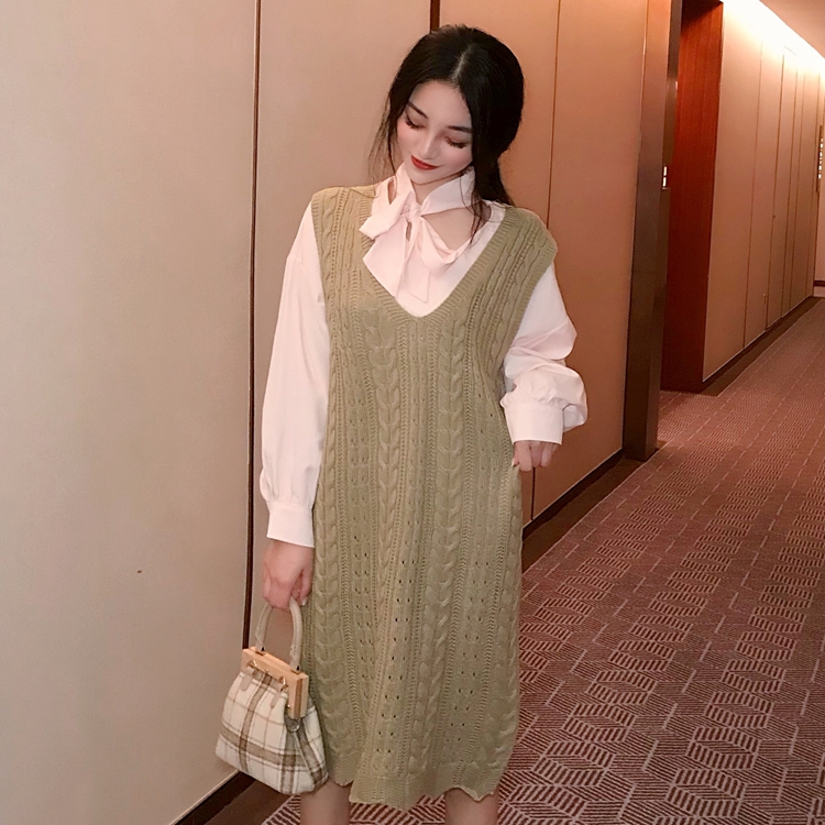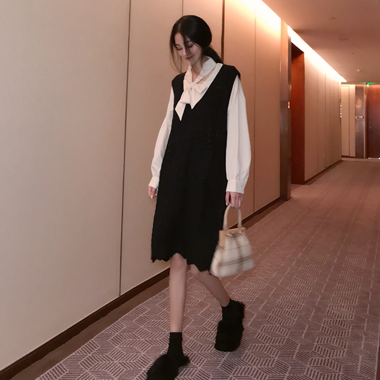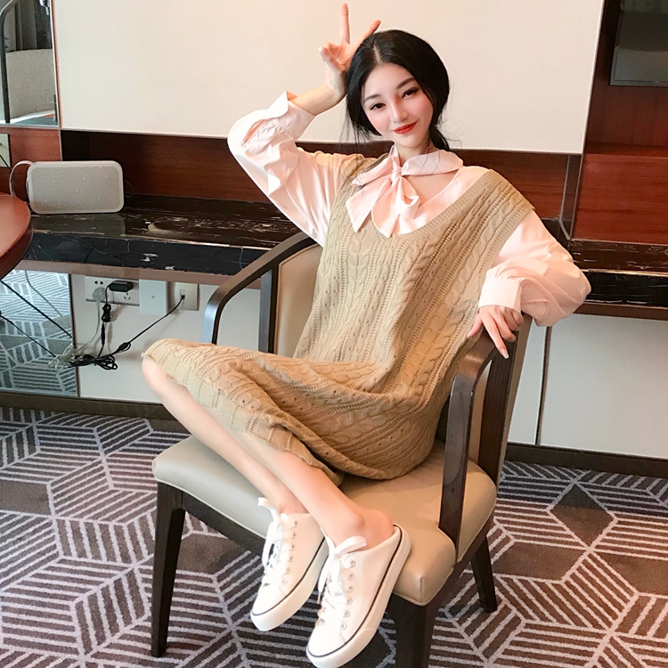 韓版套裝領口系帶百搭襯衫+V領無袖中長款針織背心裙連衣裙兩件套