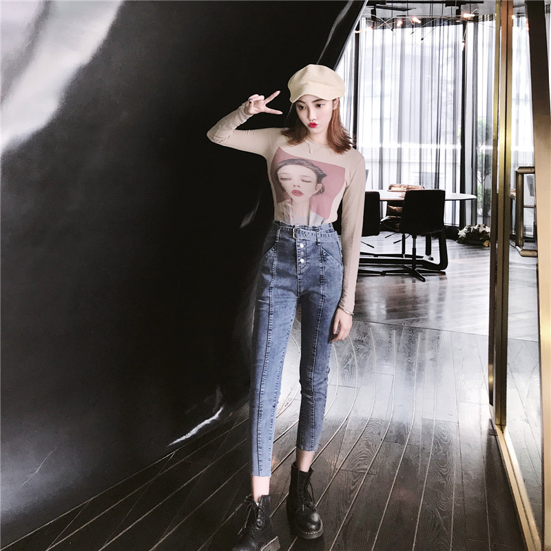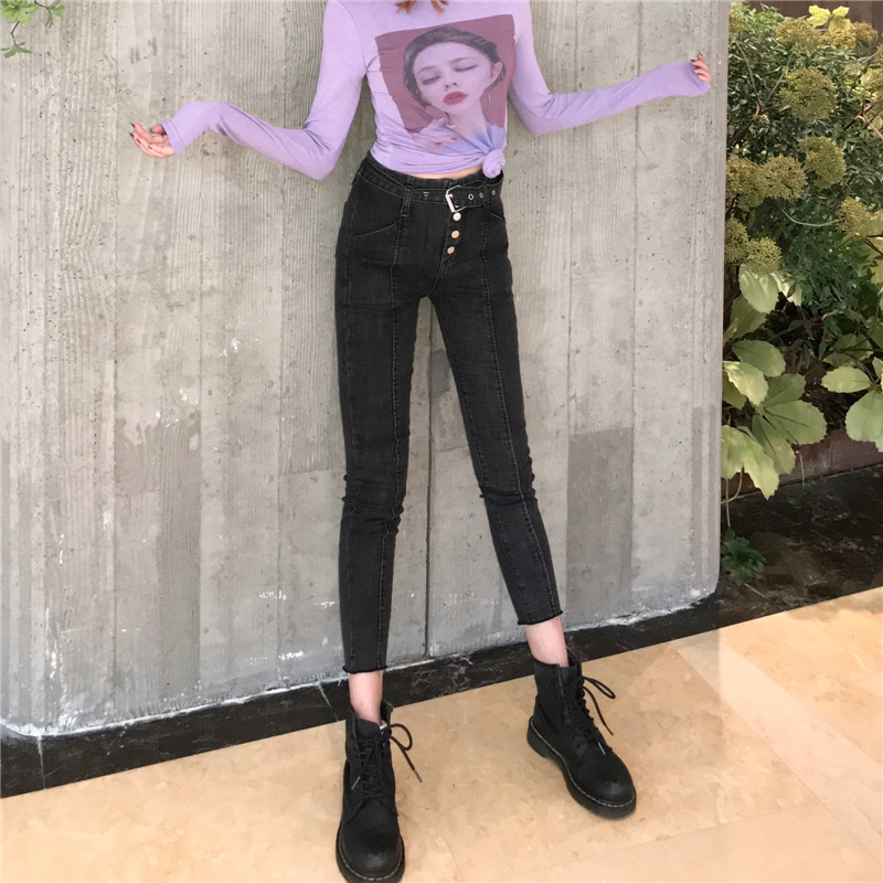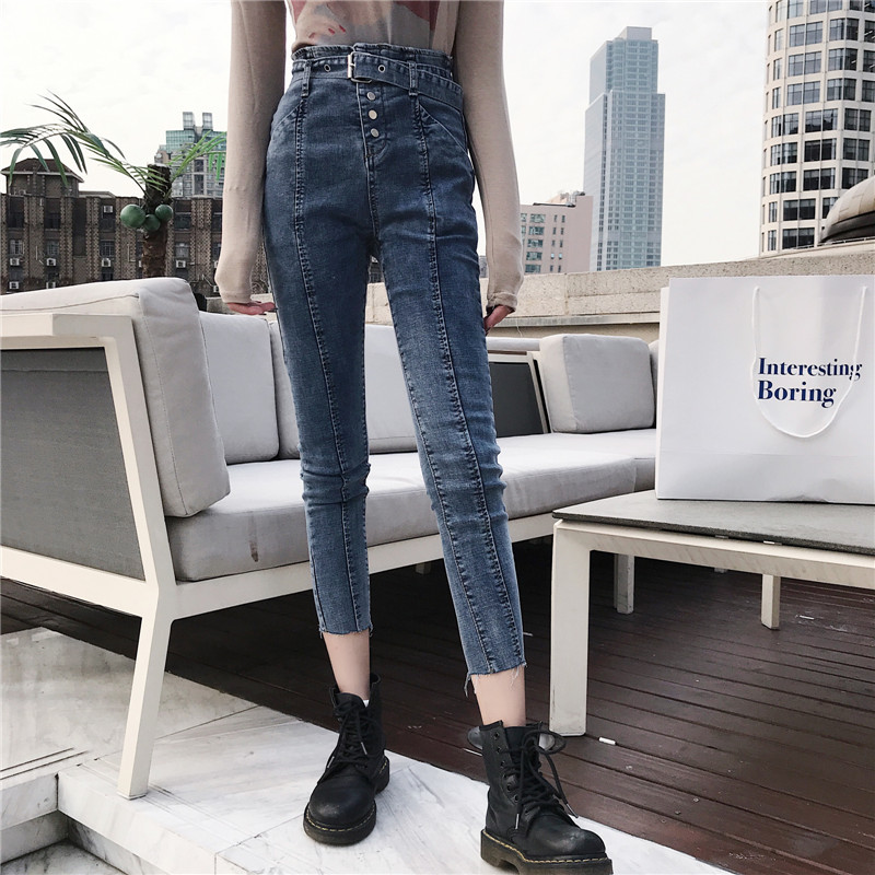高腰顯瘦排扣牛仔褲時尚韓版秋裝女2018新款配腰帶鉛筆小腳九分褲