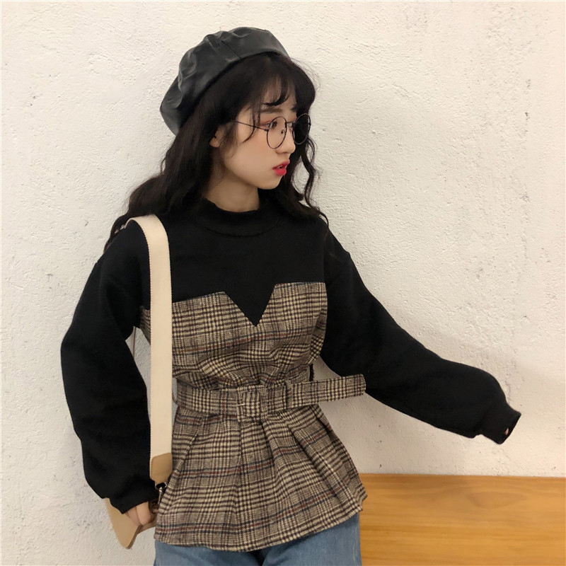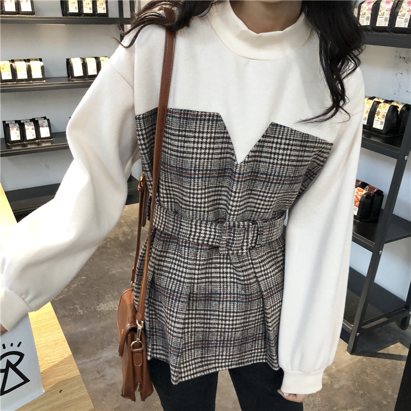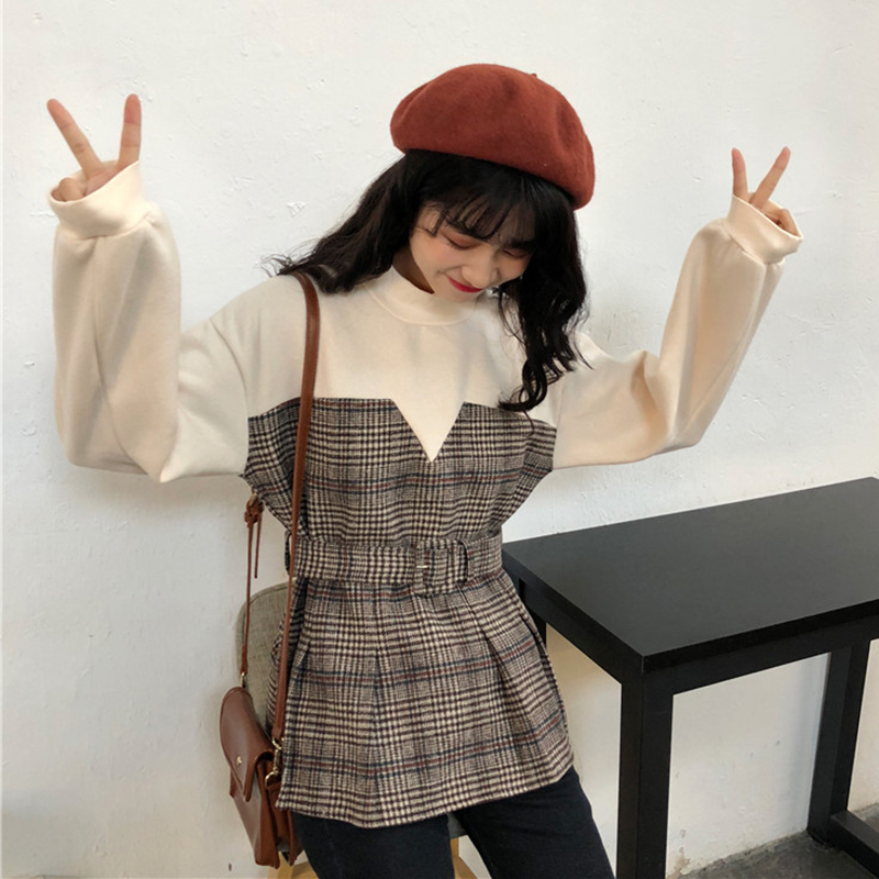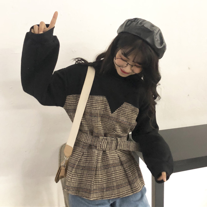 / 秋裝女2018新款韓版毛呢格子拼接加絨假兩件衛衣收腰綁帶上衣外套