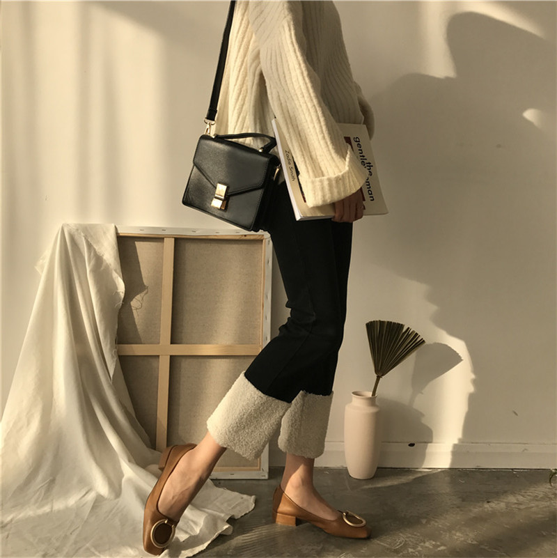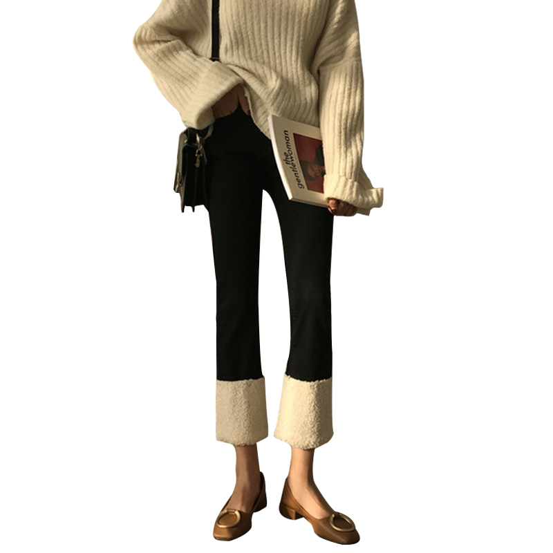 / 秋冬韓版寬松高腰直筒褲仿羊羔毛拼接彈力牛仔褲九分褲學生褲子女