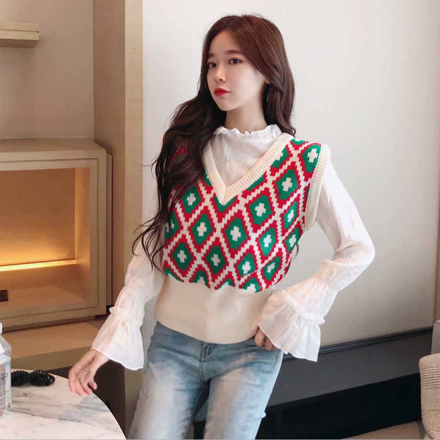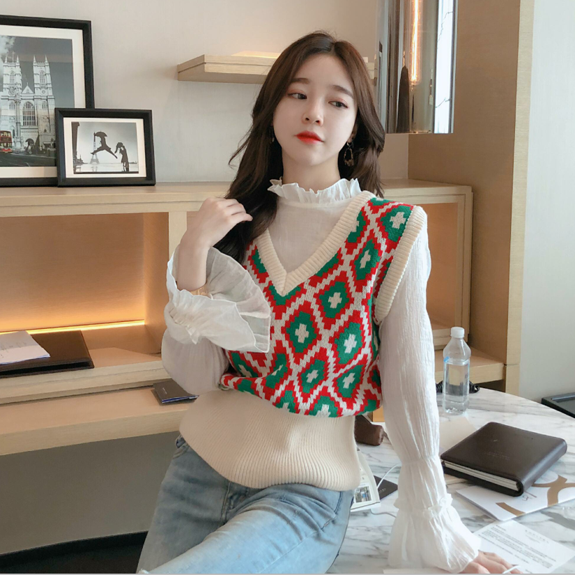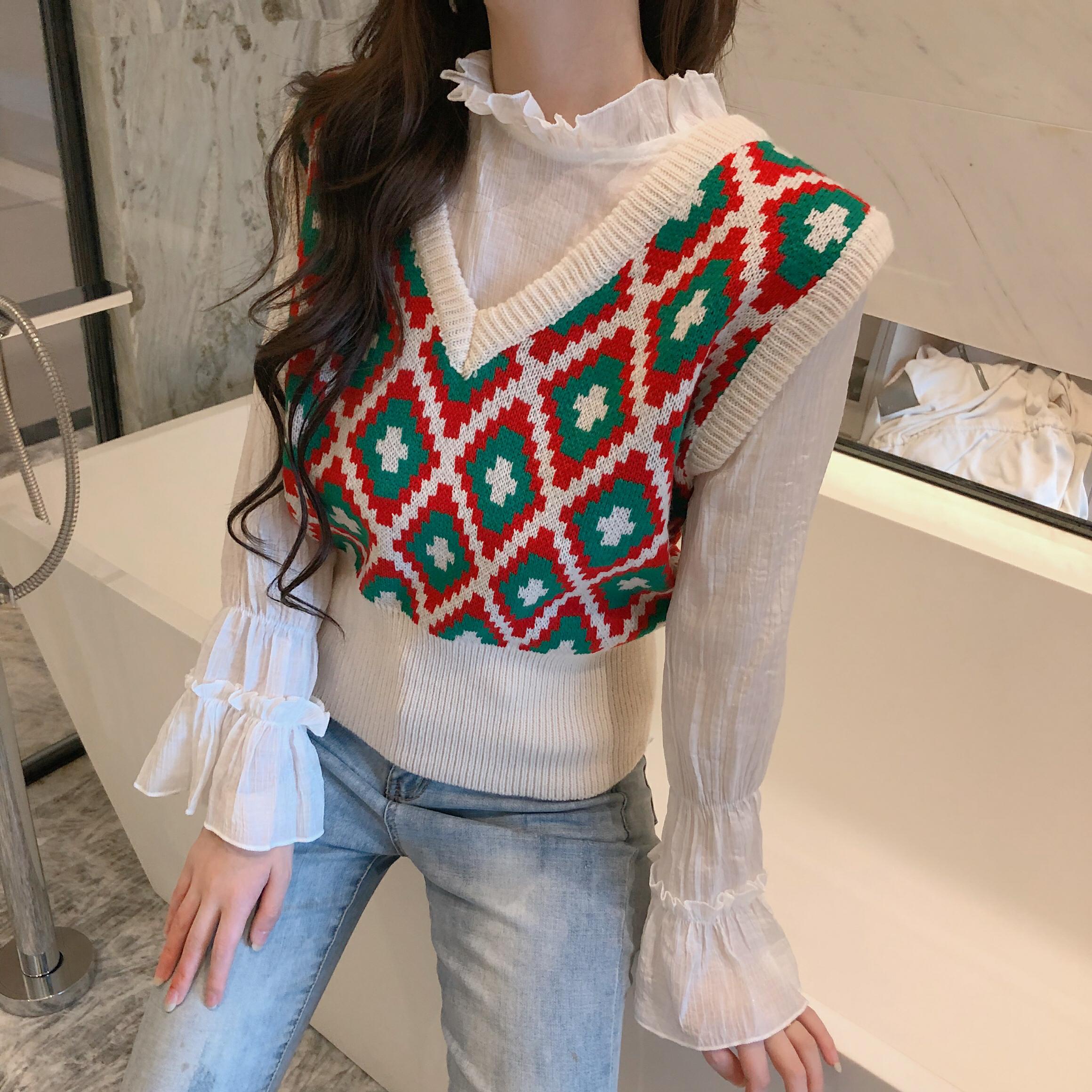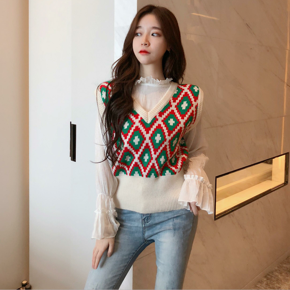 / 新款荷葉邊喇叭袖柔軟舒適打底衫菱形格毛衣馬甲時尚套裝兩件套女