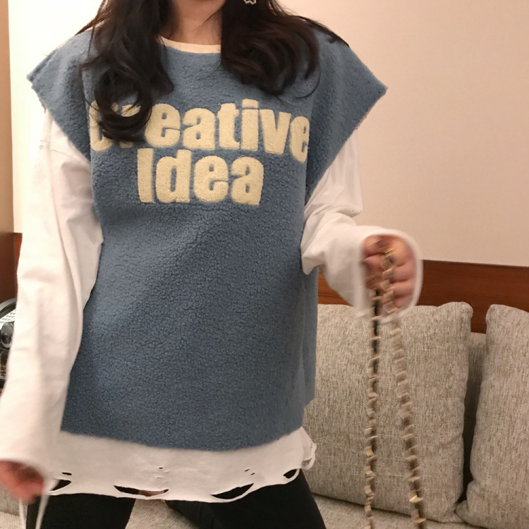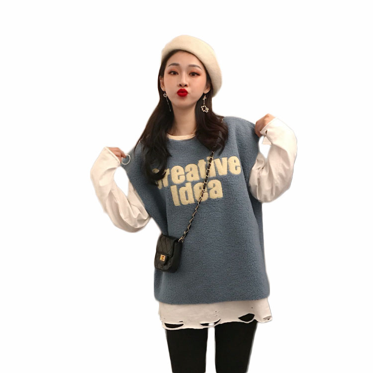 2018女神套裝新款寬松羊羔毛馬甲+冬裝上衣女慵懶長袖t袖女破洞T