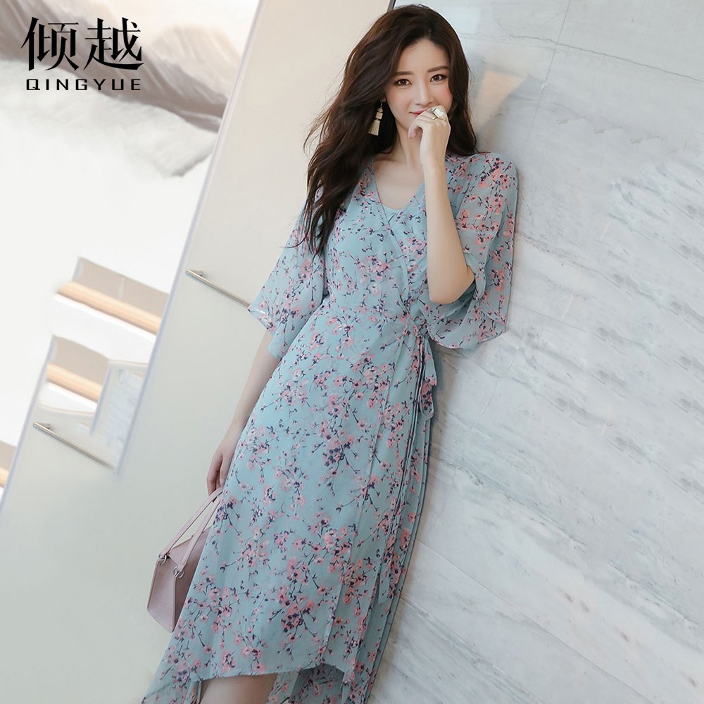 / 2017夏季新款雪紡連衣裙V領碎花沙灘裙印花性感女長裙吊帶兩件套