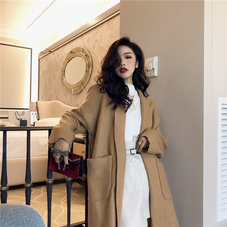 秋冬韓版百搭款氣質長袖毛呢外套女中長款過膝妮子大衣(送腰帶)