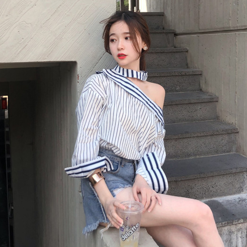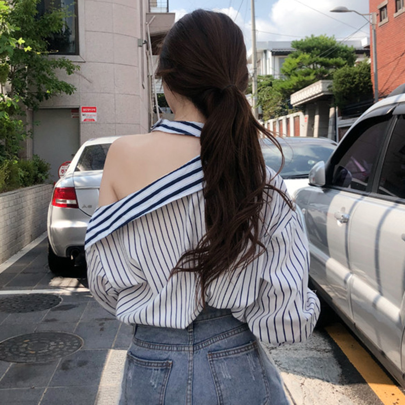 / 秋裝女2018新款韓版港風寬松長袖條紋襯衫心機個性露肩掛脖上衣潮