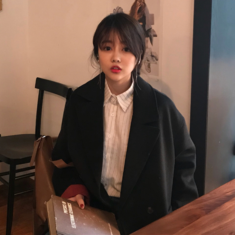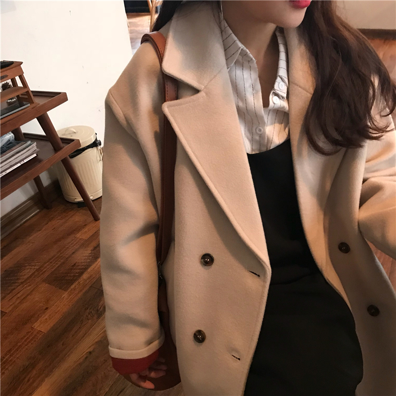 / 2018中長款毛呢外套秋冬女裝新款寬松長袖呢大衣西裝領呢子雙排扣