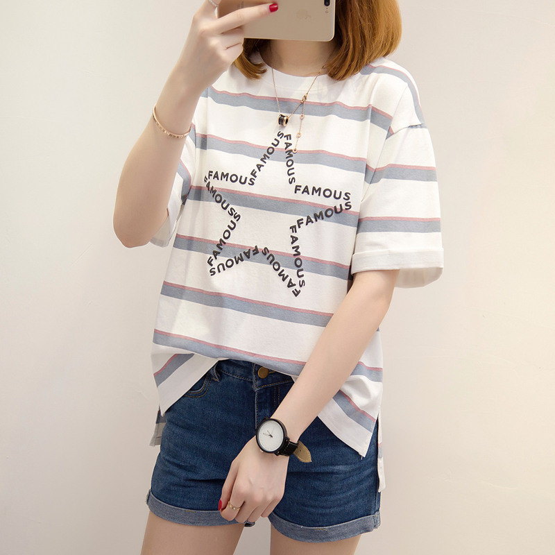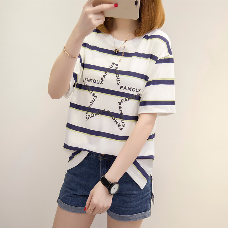 條紋t恤女短袖韓版潮夏裝新款女裝開叉時尚體恤百搭上衣女夏