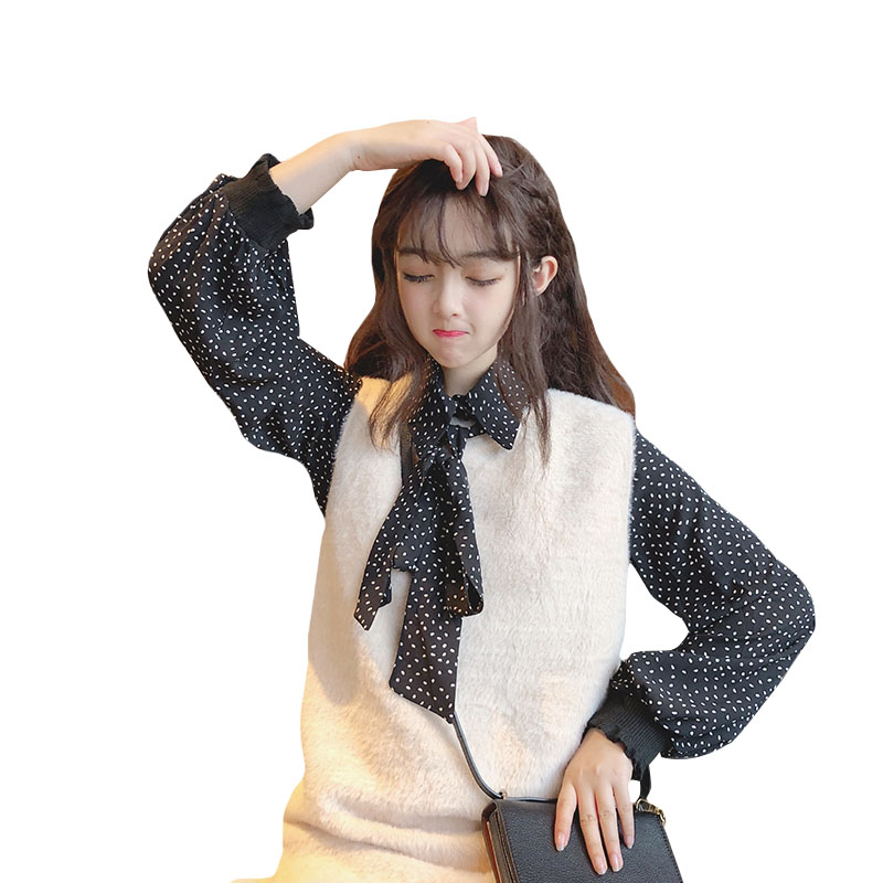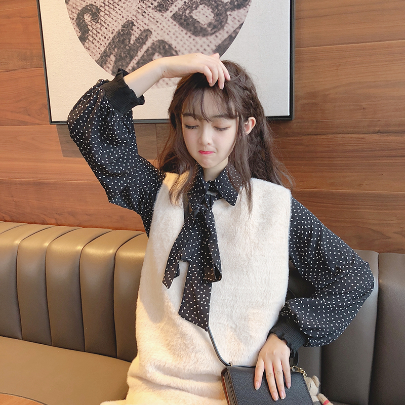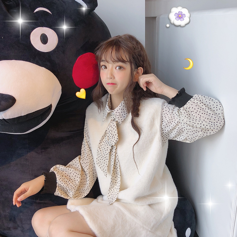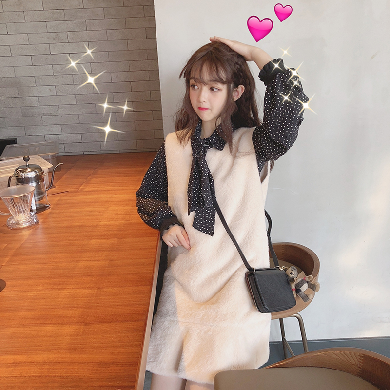 / 韓版時尚休閑套裝秋季氣質波點雪紡襯衫+毛絨馬甲背心裙兩件套女
