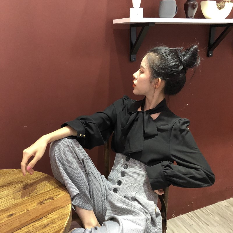 / 2018秋裝新款韓版套裝百搭氣質雪紡長袖上衣高腰排扣闊腿褲兩件套