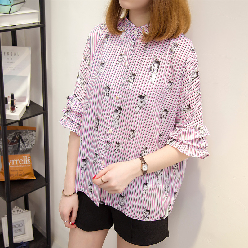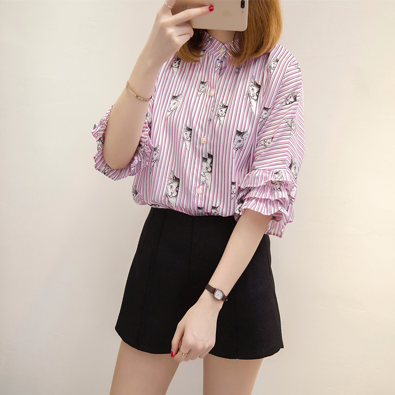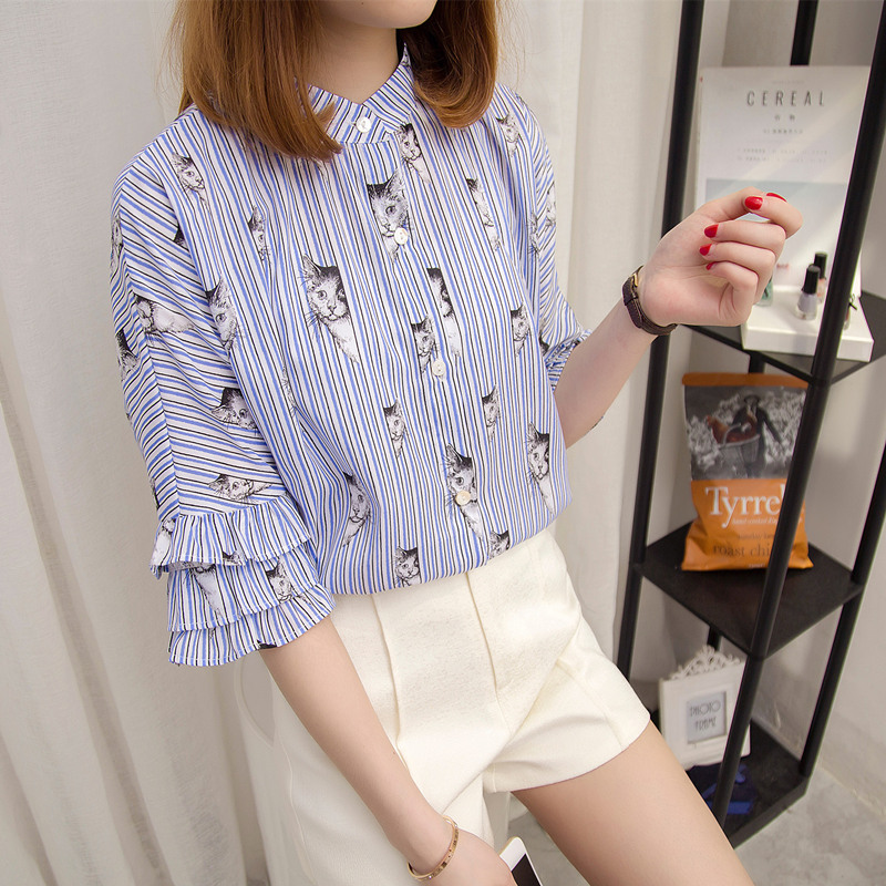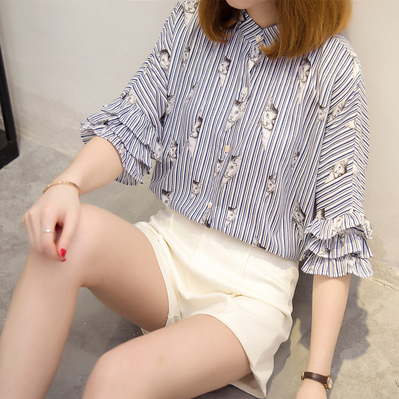 / 夏裝新款女裝條紋襯衫女半袖寬松小清新上衣襯衣女喇叭袖韓范