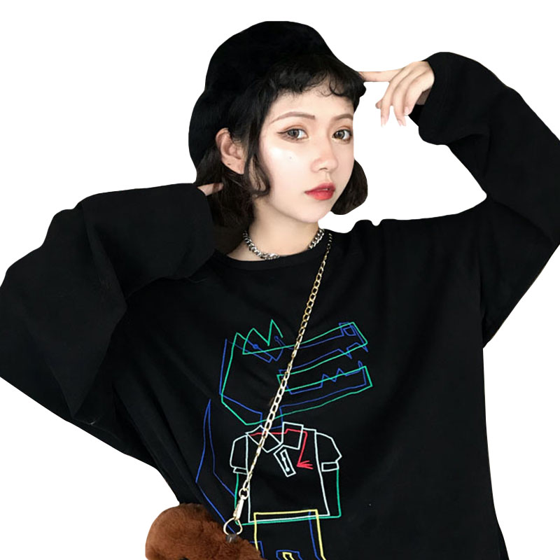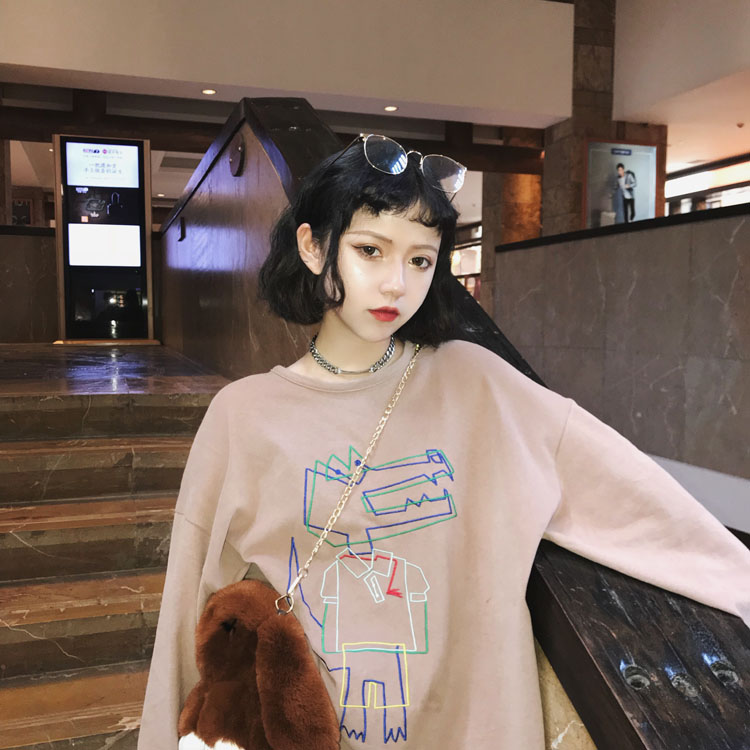 / 秋季韓版中長款原宿BF風寬松搞怪鱷魚刺繡薄款長袖T恤顯瘦上衣女