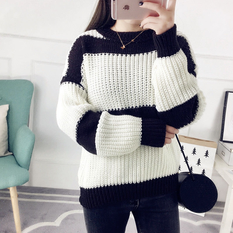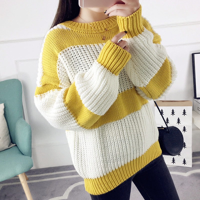 / 秋冬套頭毛衣女寬松韓版粗毛線衣條紋針織衫長袖女裝新款打底衫潮