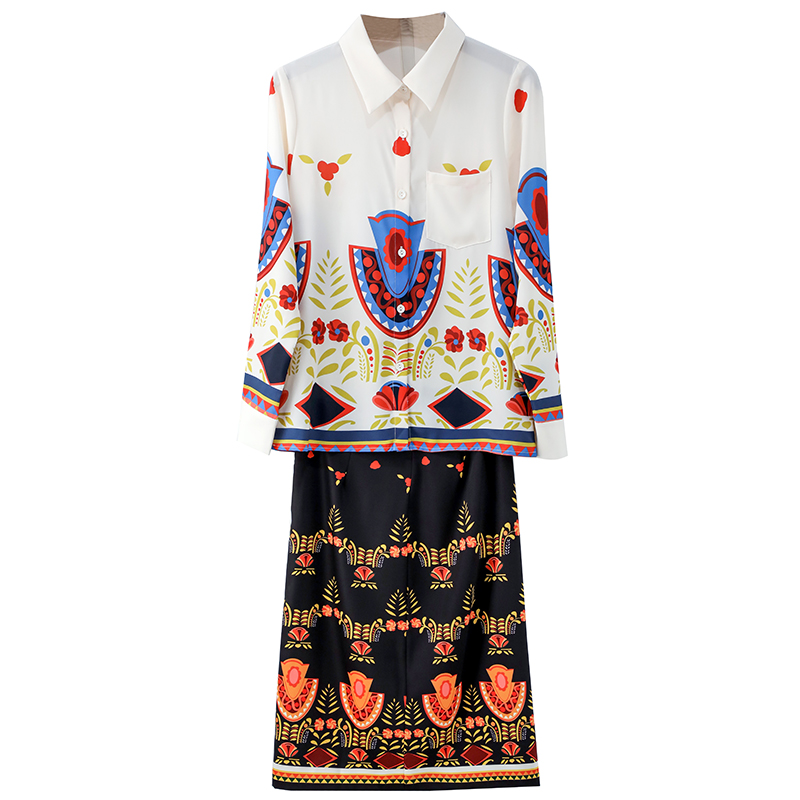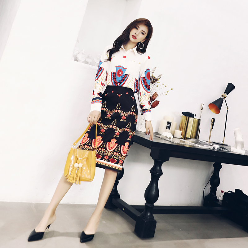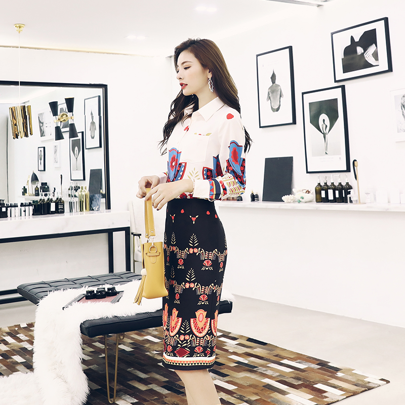 名媛氣質OL兩件套時尚印花長袖襯衫半身裙子套裝女裝秋裝2018新款