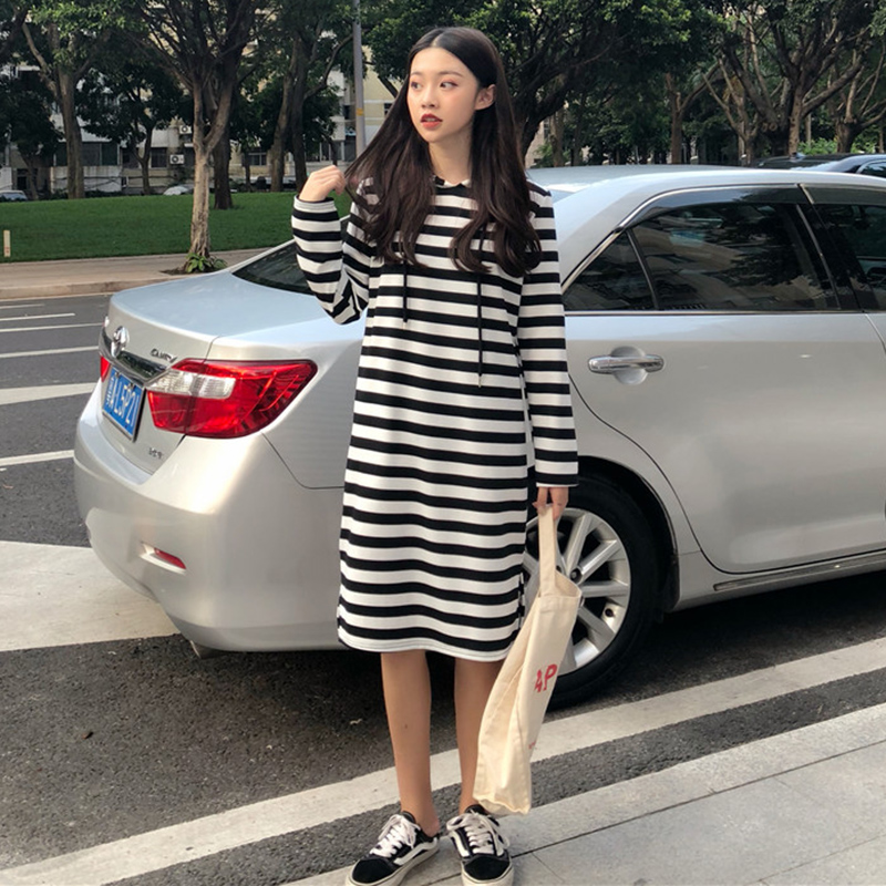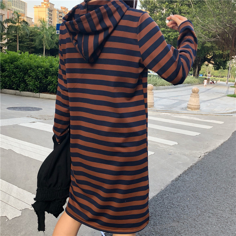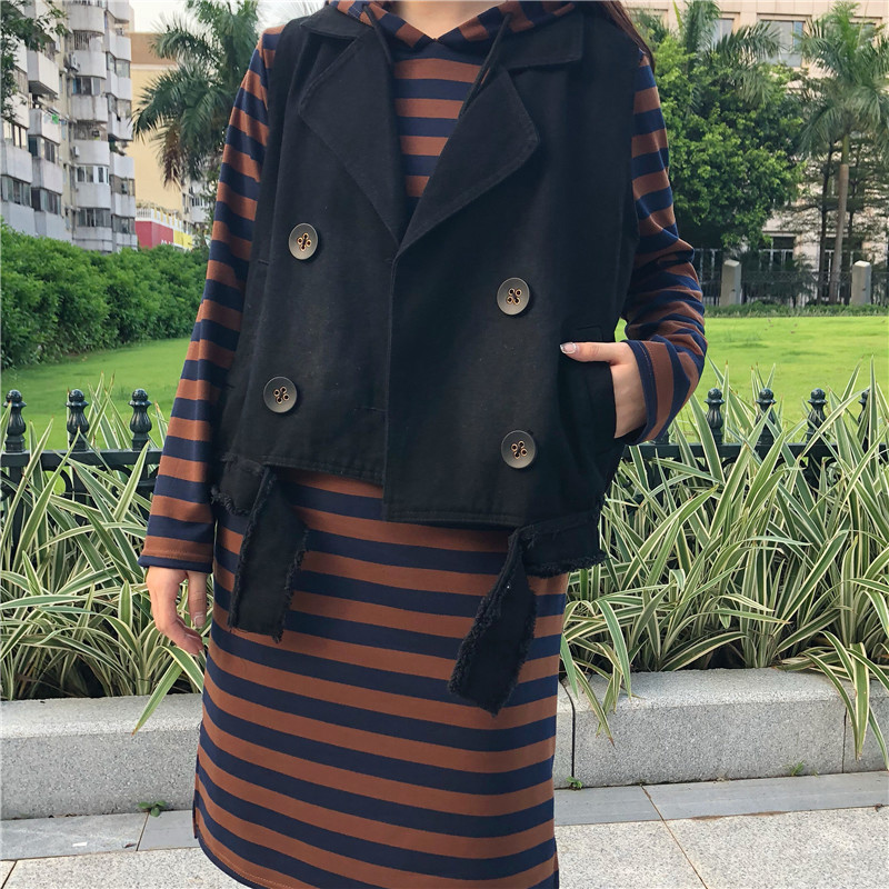 2018女秋裝新款寬松條紋長袖連帽衛衣裙+毛邊破洞牛仔馬甲兩件套