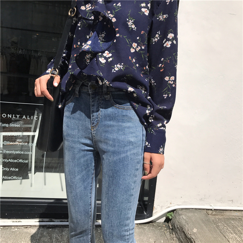 春裝女裝韓版高腰百搭修身顯瘦毛邊牛仔褲鉛筆褲淺藍色小腳褲學生