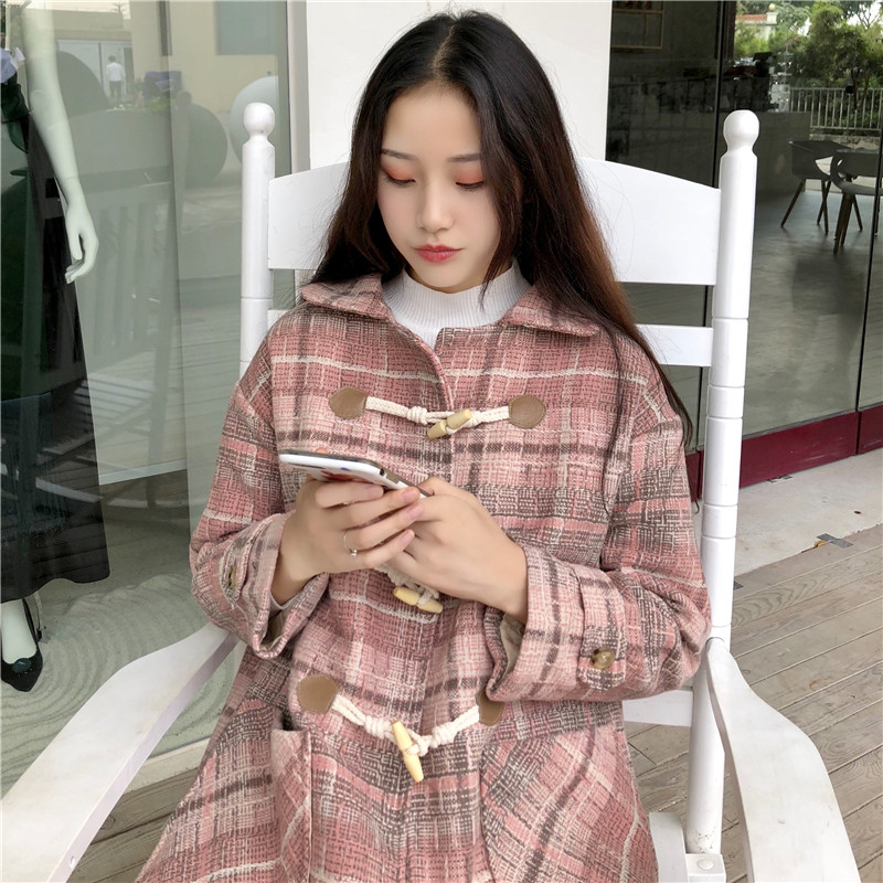 / 復古格子流行呢子大衣女秋冬裝新款韓版中長款寬松牛角扣毛呢外套