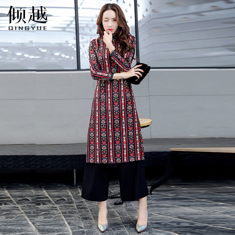 傾越2017春裝新款民族風女裝連衣裙中長裙套裝闊腿褲春秋長袖修身