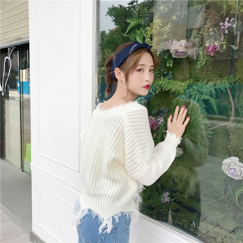 秋季女裝韓版寬松套頭V領純色不規則破邊針織衫長袖休閑毛衣上衣