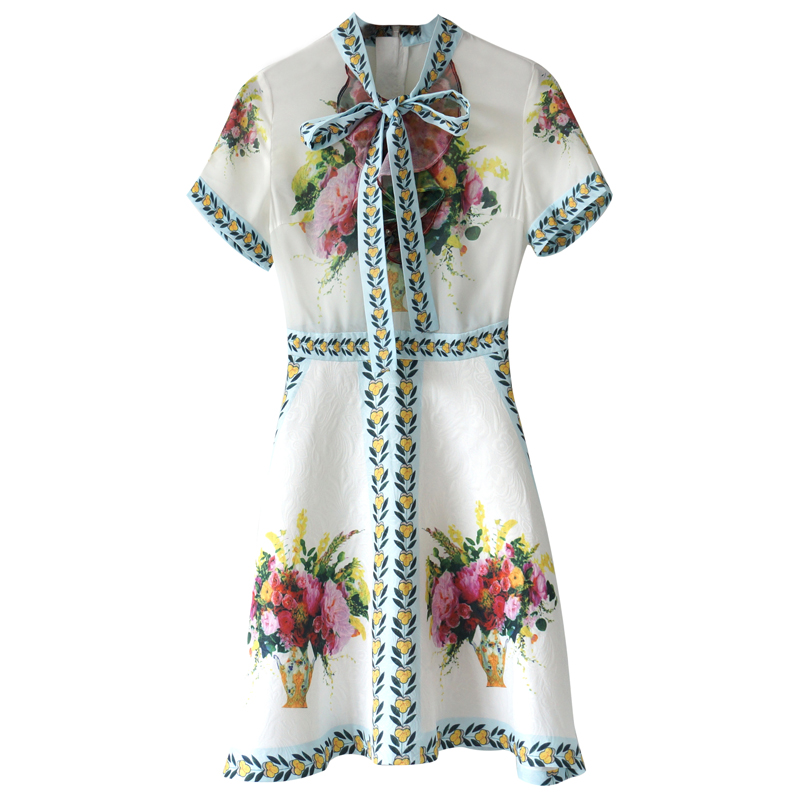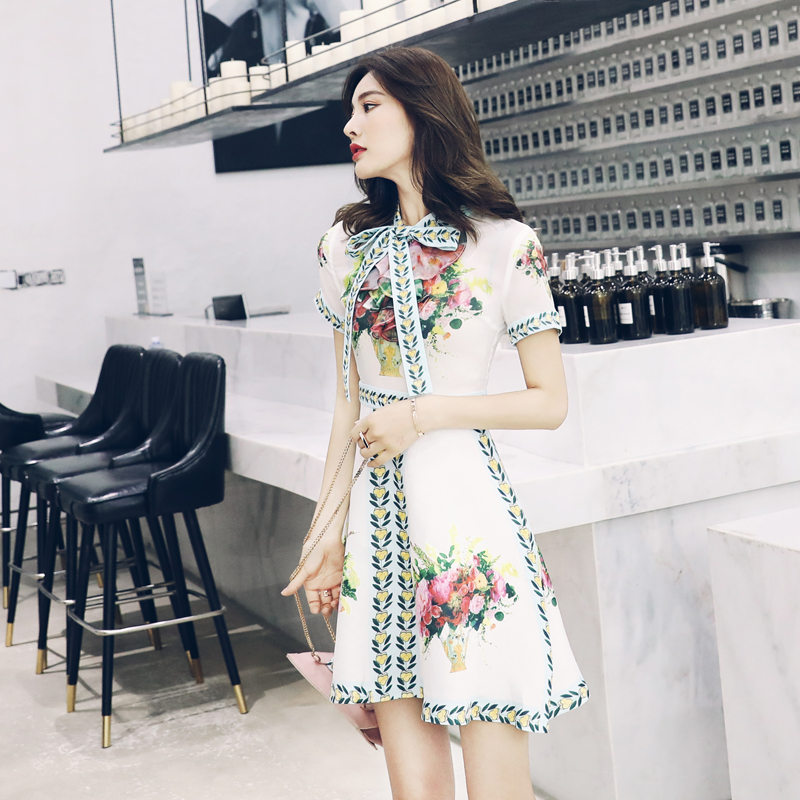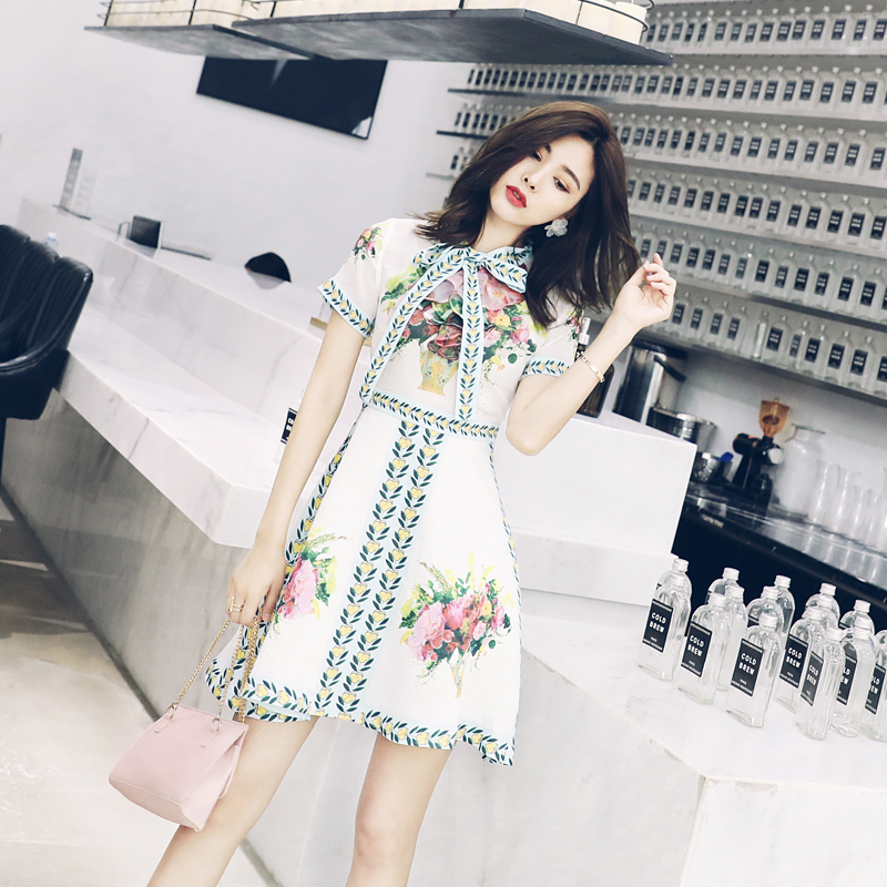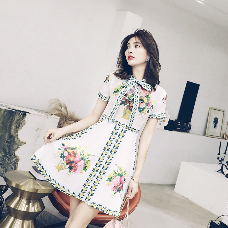 / 小清新女裝網紅款2018新款顯瘦高腰蝴蝶結短袖減齡氣質印花連衣裙