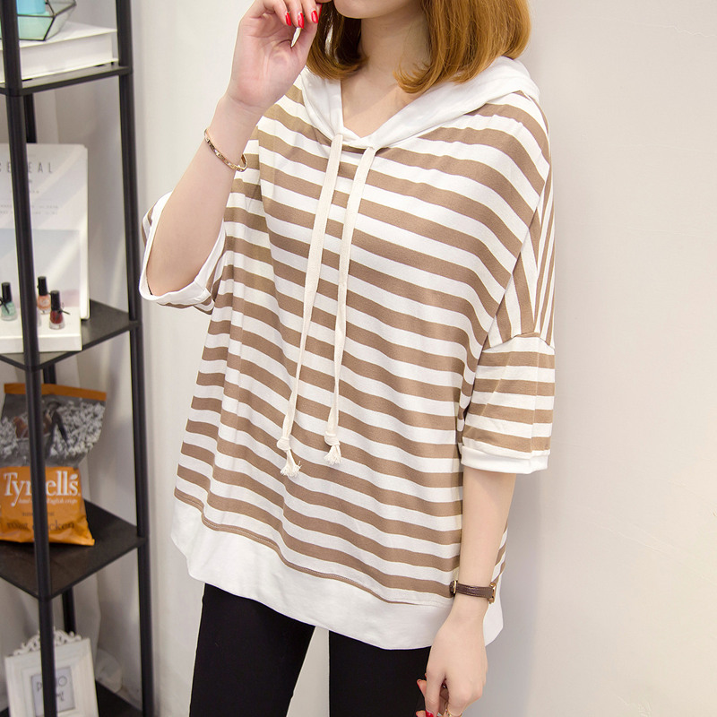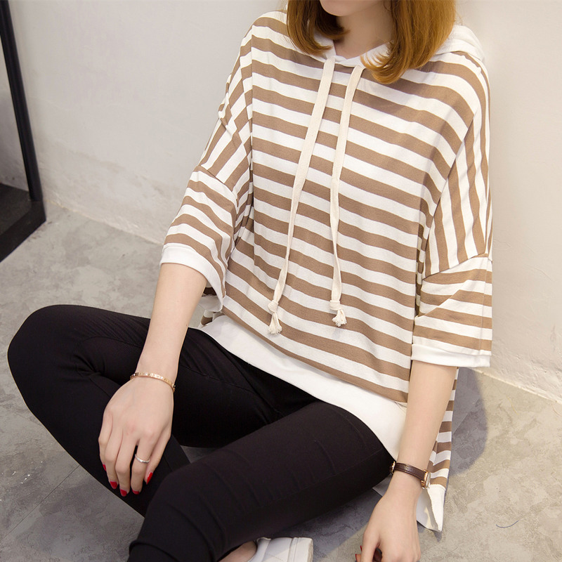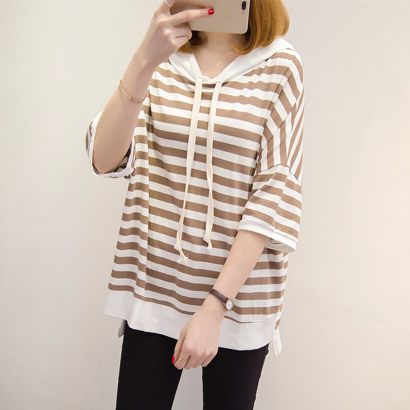 / 條紋短袖t恤女寬松連帽上衣體恤衫中長袖韓版女裝夏裝新款潮
