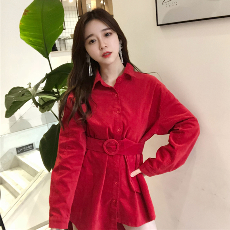 / 秋裝女2018新款個性不規則中長款紅色襯衫氣質收腰綁帶長袖上衣潮