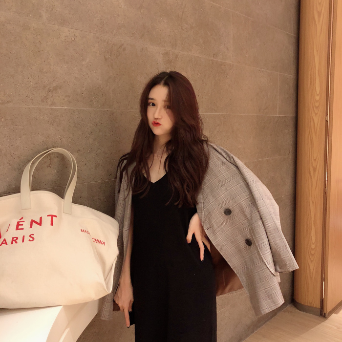 時尚chic小西裝外套寬松港風復古西服+V領針織吊帶連衣裙兩件套潮