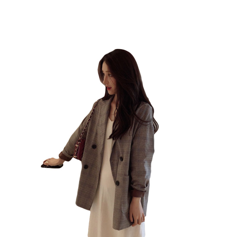 韓版時尚外套女春秋新款格紋西服寬松復古中長款格子小西裝上衣潮