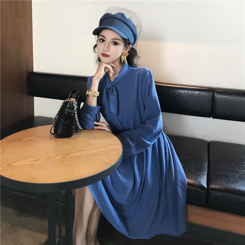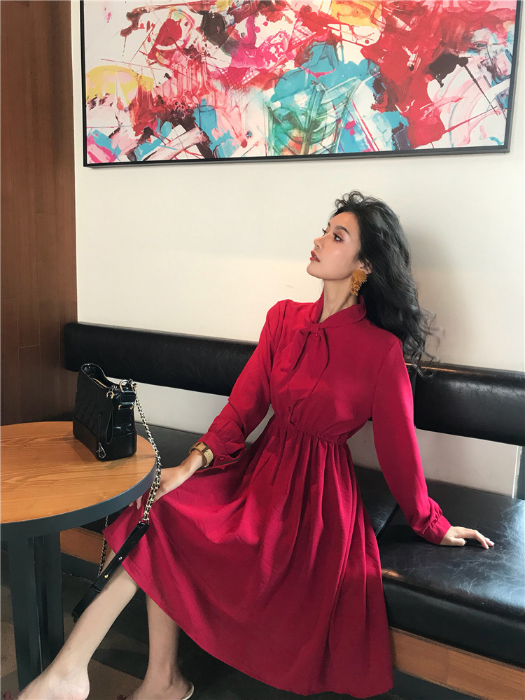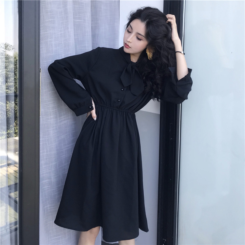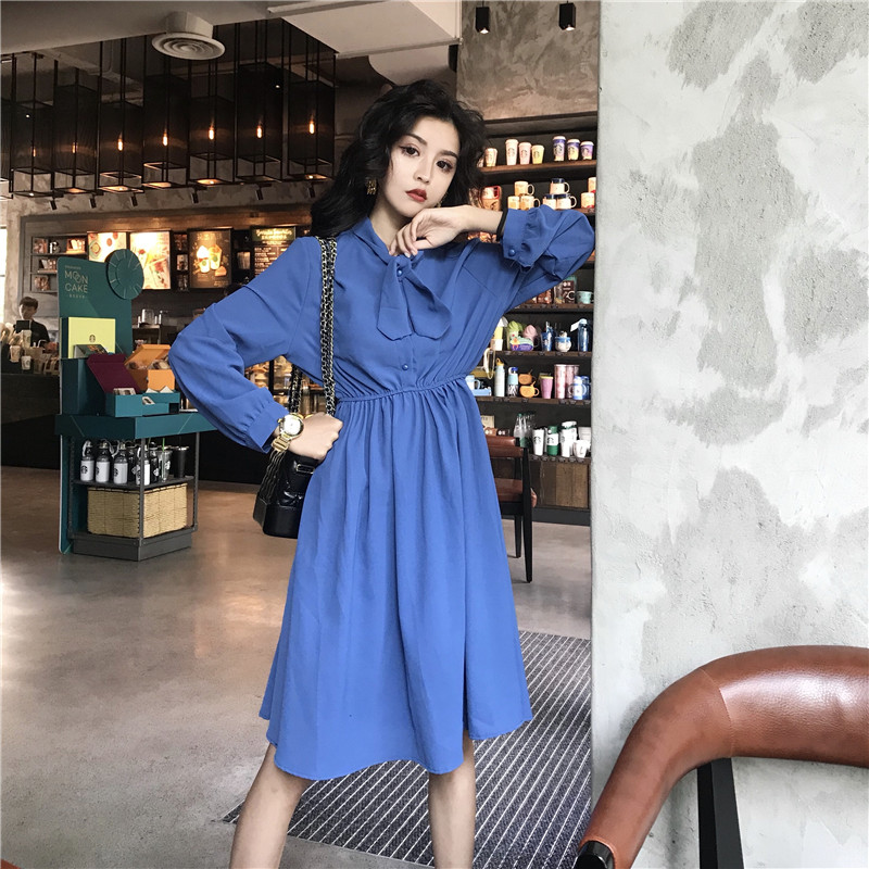 / chic早秋新款韓版復古晚晚風氣質百搭中長款松緊高腰顯瘦連衣裙女