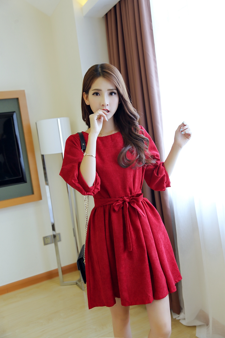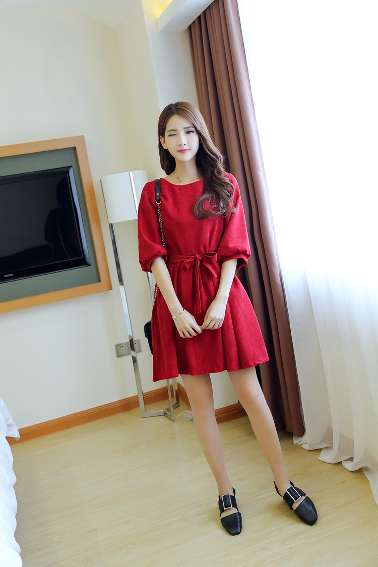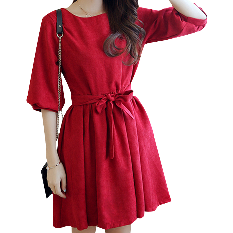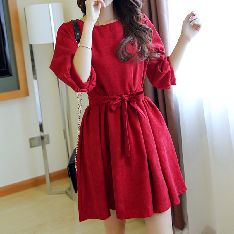 / 秋裝女裝OL氣質百搭燈芯絨A字連衣裙燈籠袖收腰顯瘦圓領套頭短裙