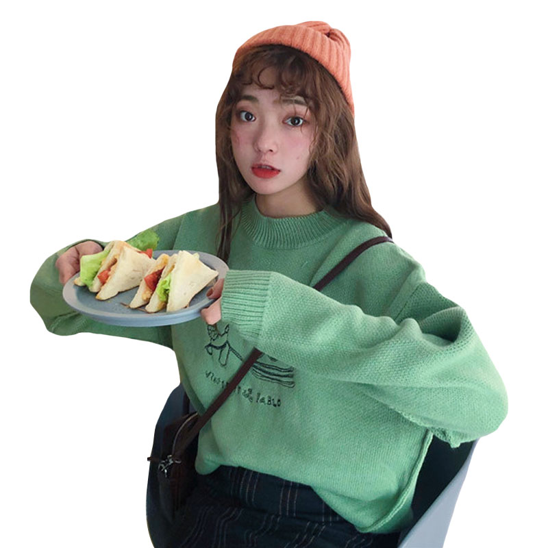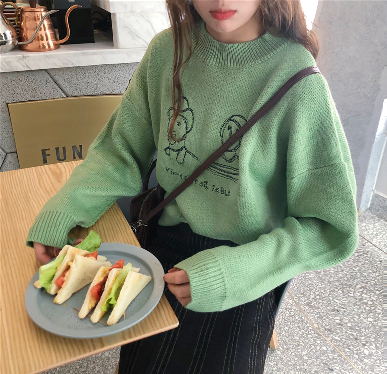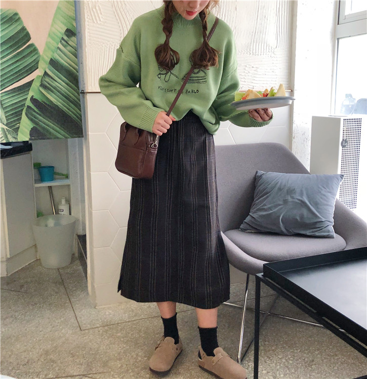 韓版時尚休閑套裝秋季女裝卡通慵懶風毛衣外套+格紋半身裙兩件套
