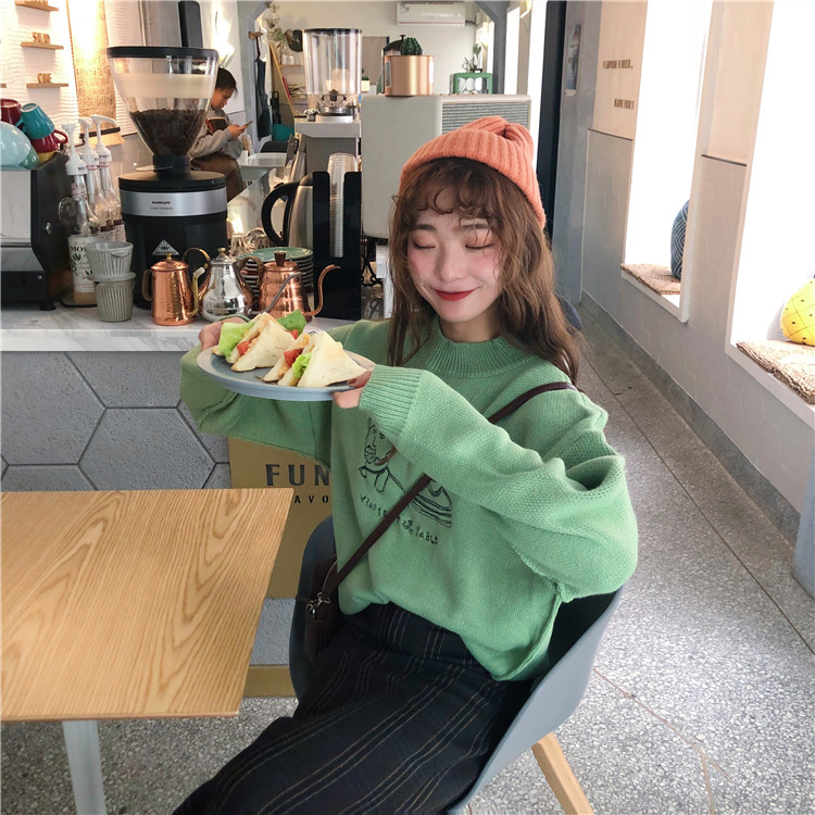/ 韓版時尚休閑套裝秋季女裝卡通慵懶風毛衣外套+格紋半身裙兩件套