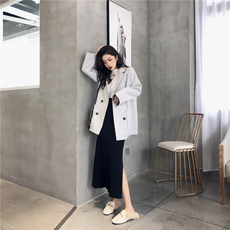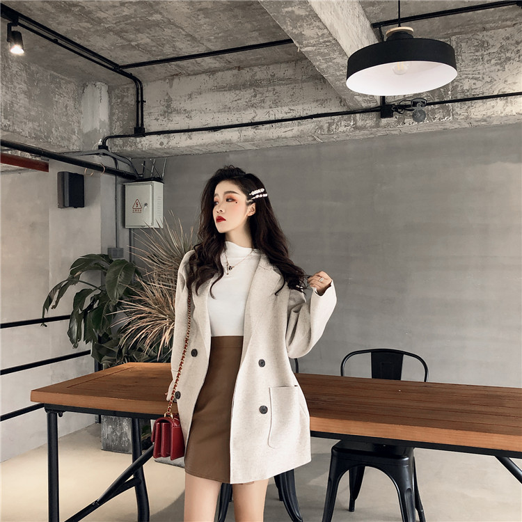 / 外套女春秋2018新款韓版百搭氣質雙排扣西服領寬松中長款毛呢外套