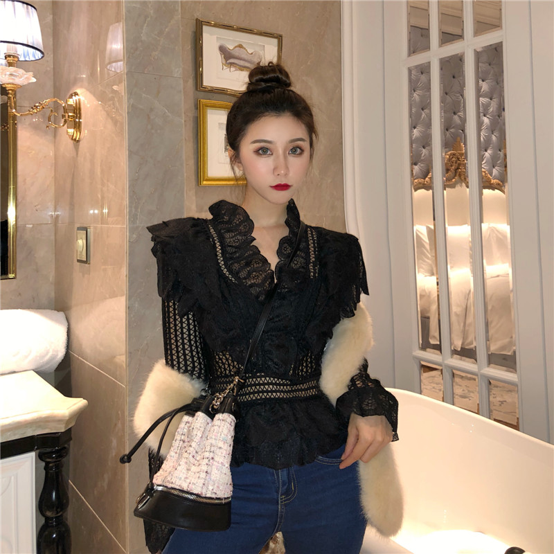 / 韓版氣質蕾絲衫秋冬新款百搭拼接鏤空V領荷葉邊套頭打底衫上衣女