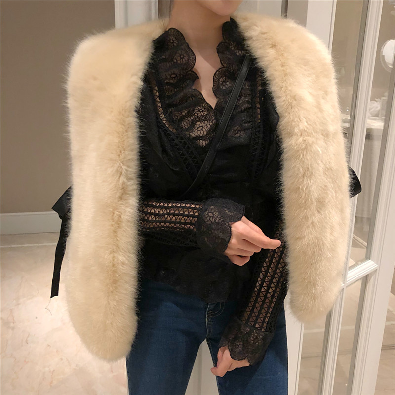 秋裝女2018新款貂絨小外套女+ 蕾絲流蘇洋氣小衫+亮絲高腰包臀裙