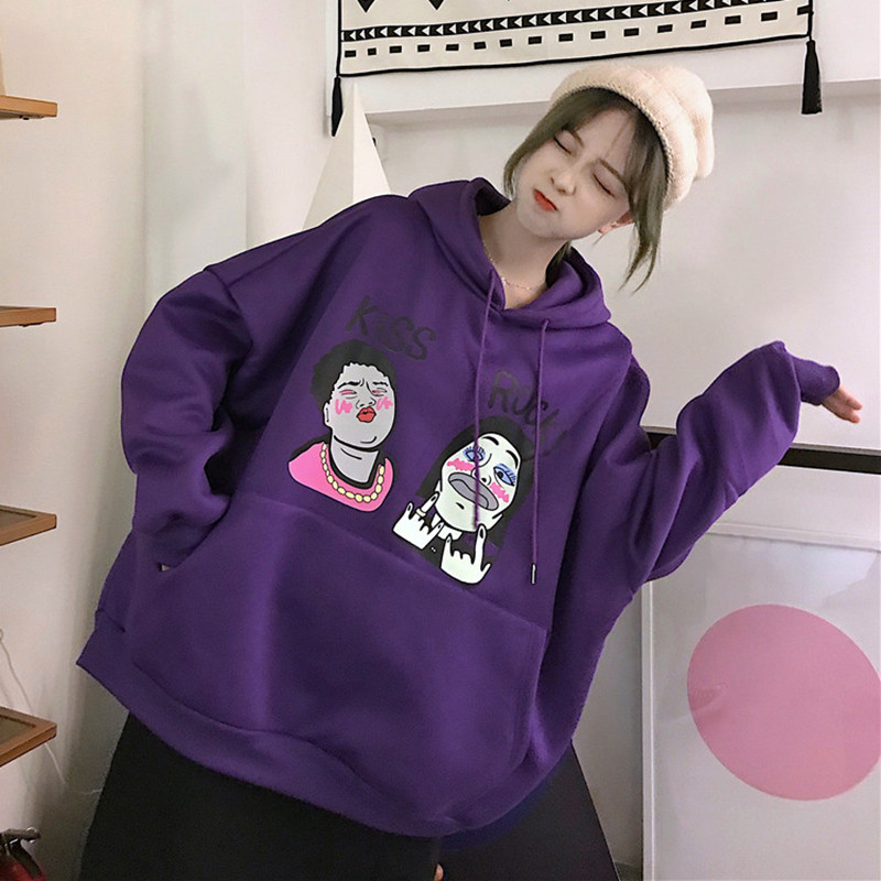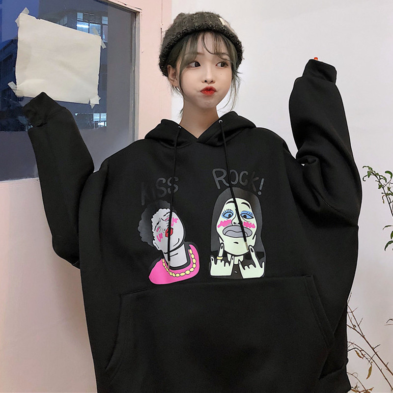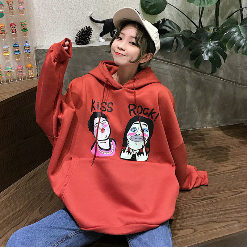 / 秋冬女裝韓版中長款原宿風加絨加厚搞怪卡通連帽寬松衛衣上衣外套