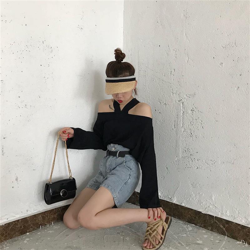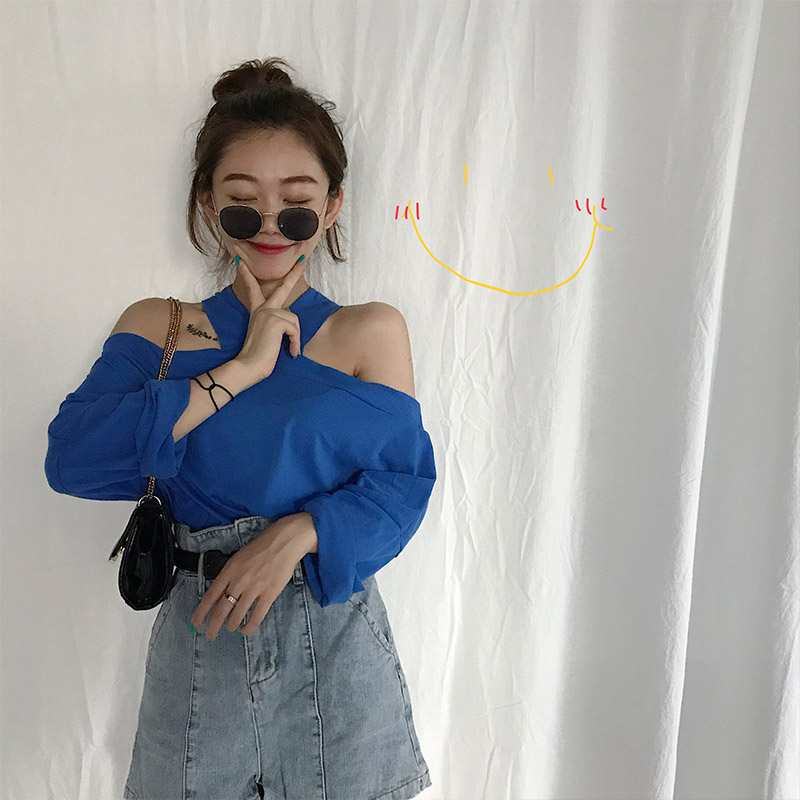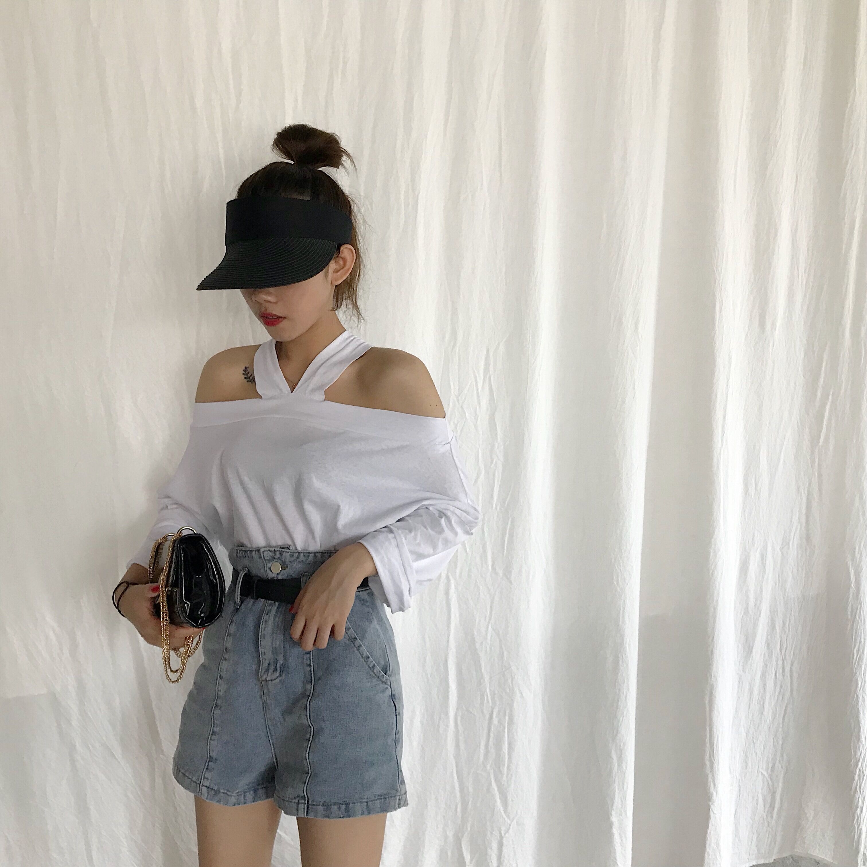 / 新款小心機掛脖性感套頭露肩一字寬松長袖T恤純色打底衫防曬衫女