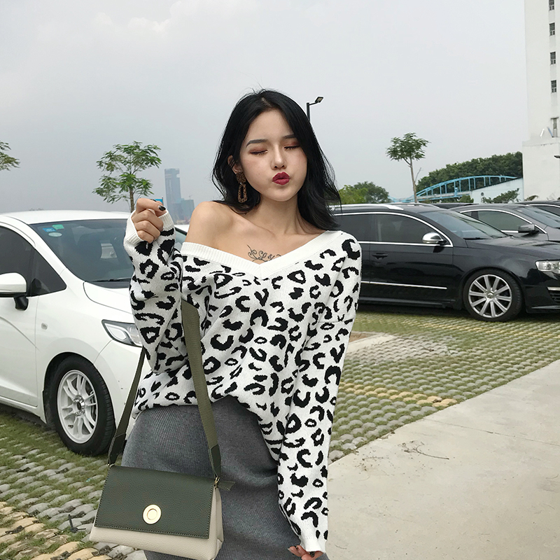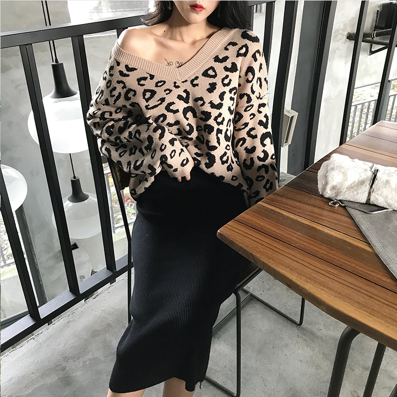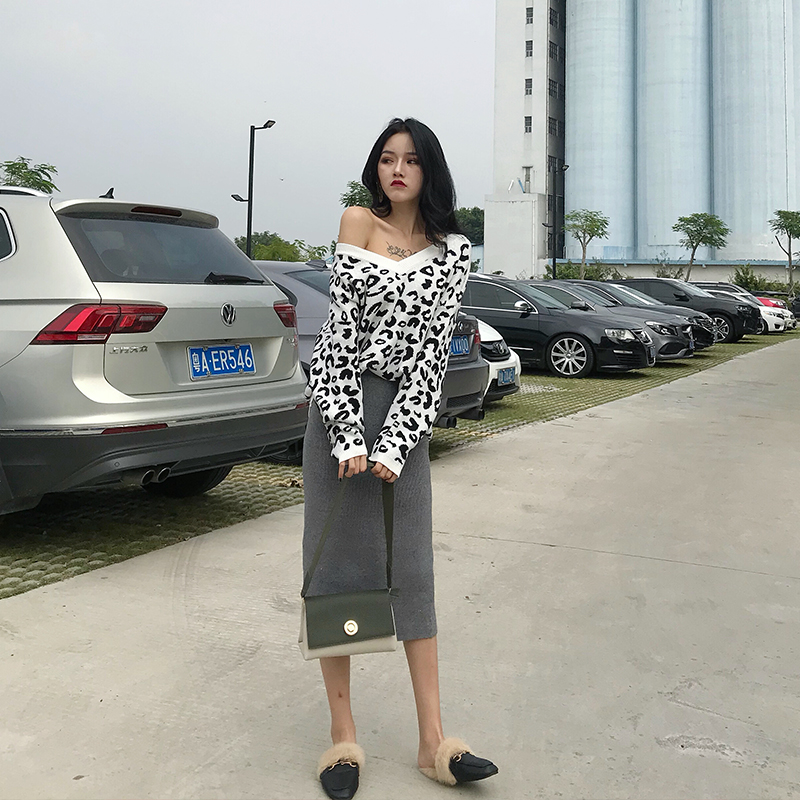 / 新款韓版斑點時尚風V領寬松上衣+復古chic純色中長裙針織衫裙套裝