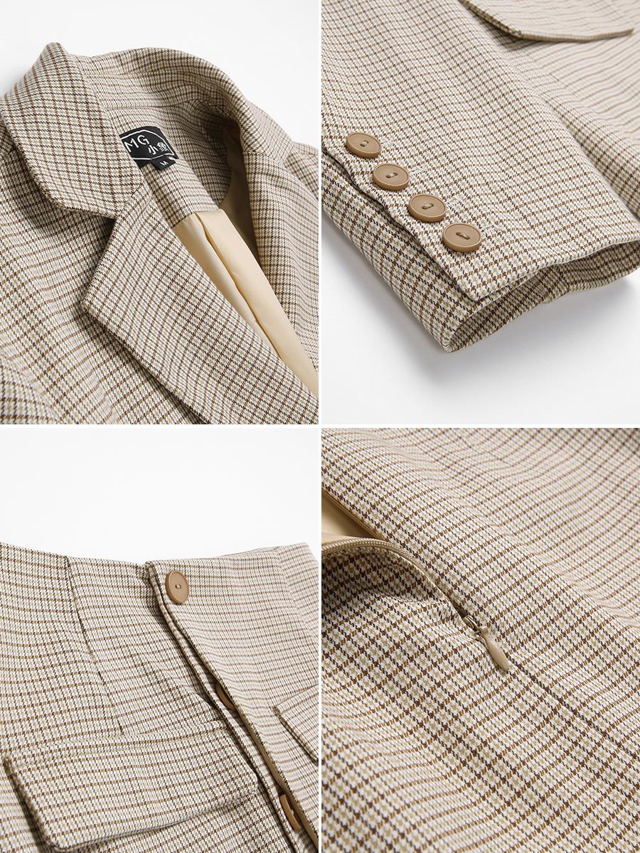 / MG小象西裝格子外套女2018新款高腰短裙休閑港味復古chic西服上衣