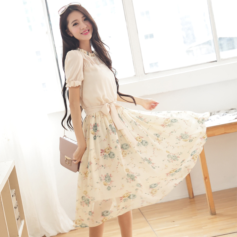 / 夏裝韓版連衣裙小清新寬松碎花雪紡連衣裙中長裙短袖女公主裙