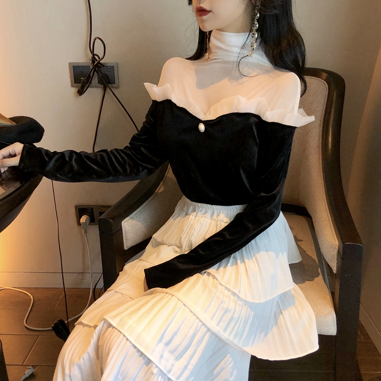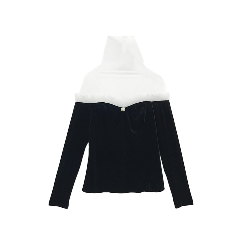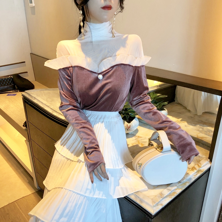 / 韓版chic早秋上衣女慵懶長袖t袖女氣質網紗拼接木耳邊長袖打底衫