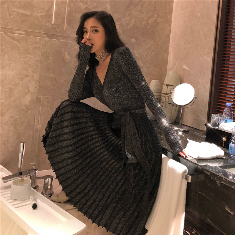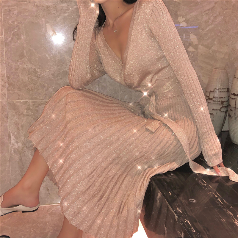 針織連衣裙女長袖2018秋裝新款v領中長款修身打底裙晚晚風裙子潮