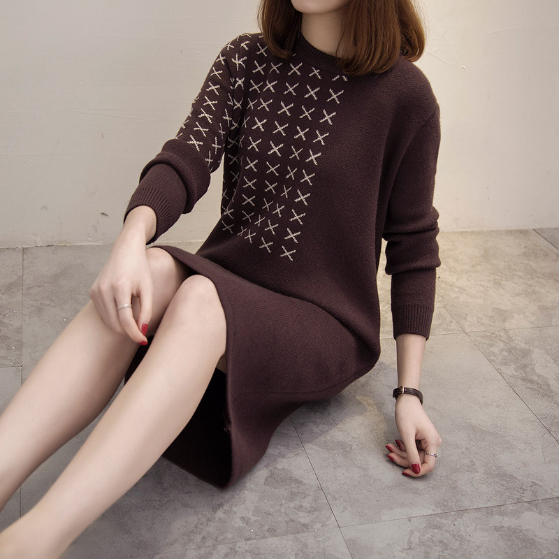 / 中長款套頭毛衣女秋冬韓版針織衫加厚毛衣裙毛線衣寬松拼色打底衫