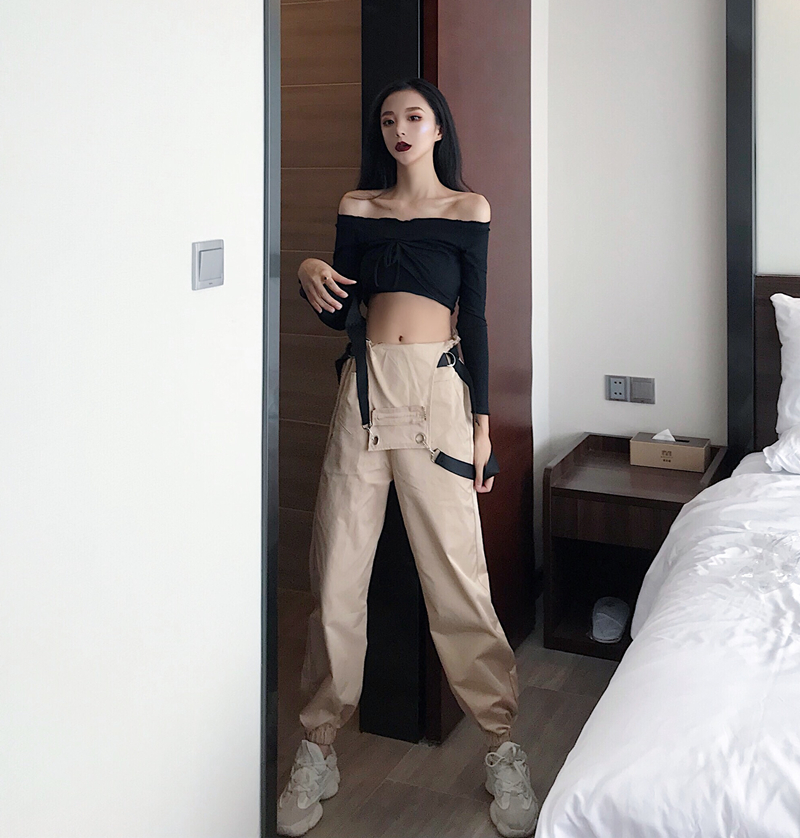 秋裝女2018新款高腰口袋嘻哈寬松束腳工裝褲+背帶露腰T恤女兩件套