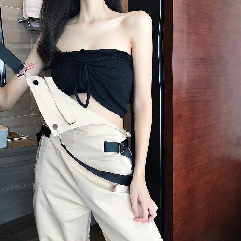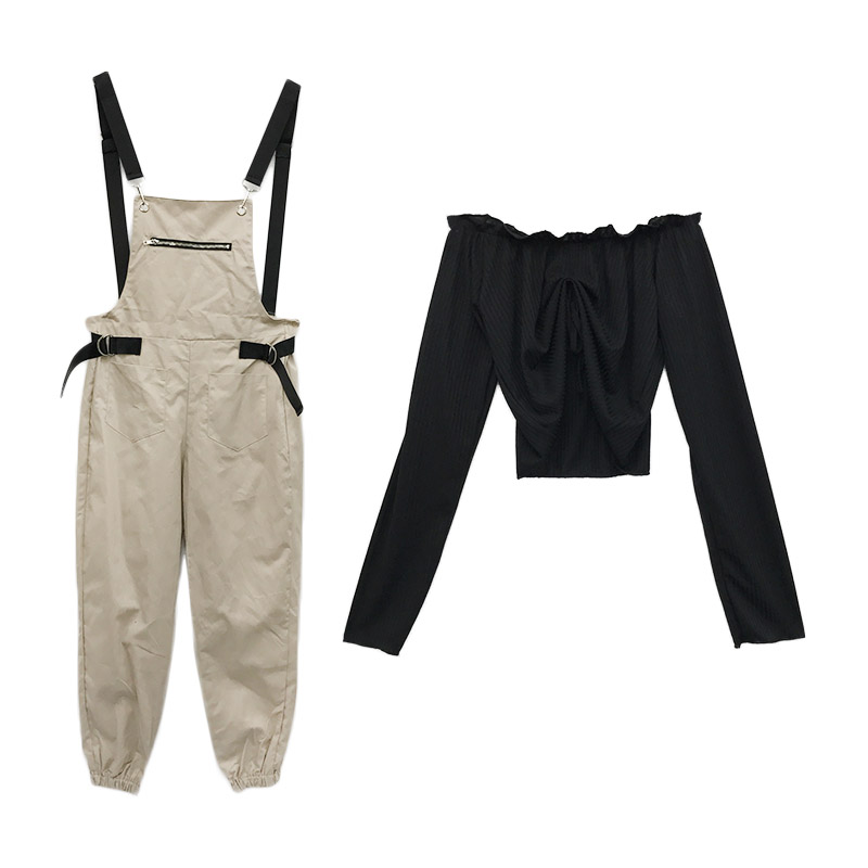/ 套裝女夏卡其色工裝背帶褲韓版休閑闊腿褲+兩穿短款一字領上衣潮