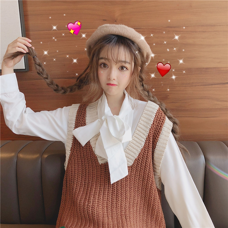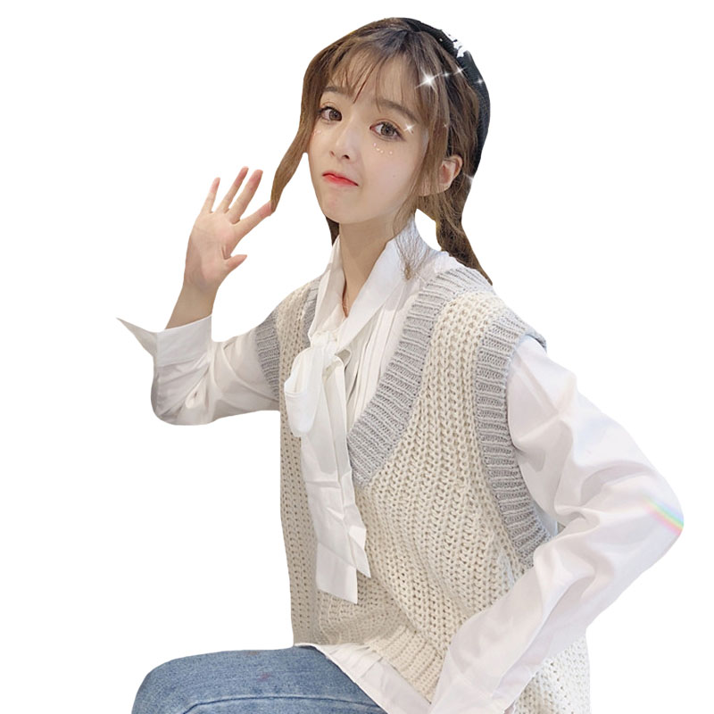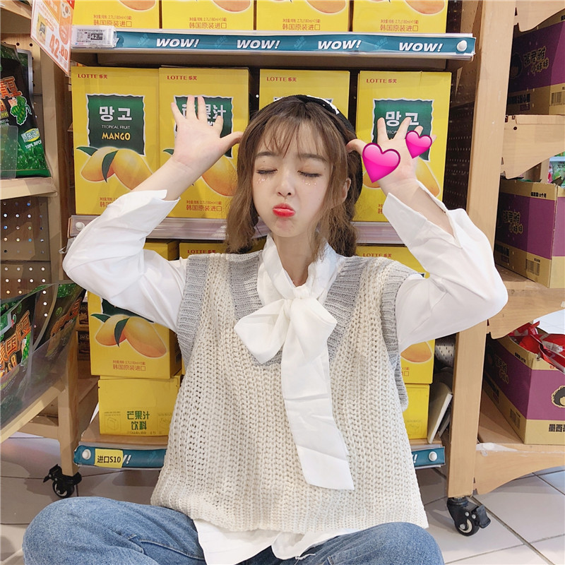 / 韓版時尚休閑套裝秋季女裝v領針織馬甲背心+長袖蝴蝶結襯衫兩件套