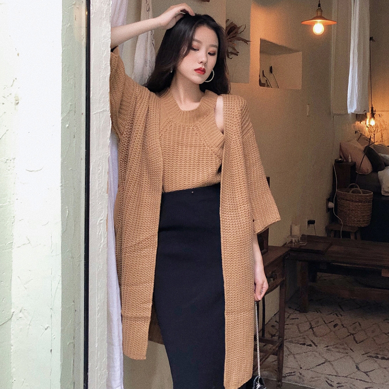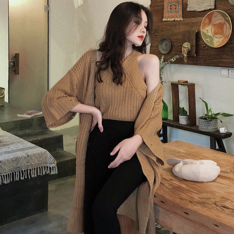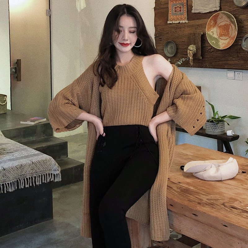 時尚套裝女秋冬2018新款短款掛脖針織背心中長款寬松長袖毛衣外套